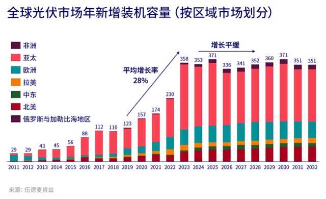 进入2024年,光伏装机如此惊人的超常规增长恐怕不太可能复现,电源侧光伏装机放量后,电网输送、本地消纳的压力将会凸显,电网工程后续更新改造投资需要周期,因此知名咨询机构伍德麦肯兹预测,2024-2028年全球光伏新增光伏装机将进入平台期,市场渗透S型曲线的陡峭阶段结束,步入增长放缓的成熟期,甚至有几年可能会出现收缩;中国电力企业联合会发布的预测报告则对今年新增光伏装机量给出了171GW的预测,较去年“天量”有所回落。