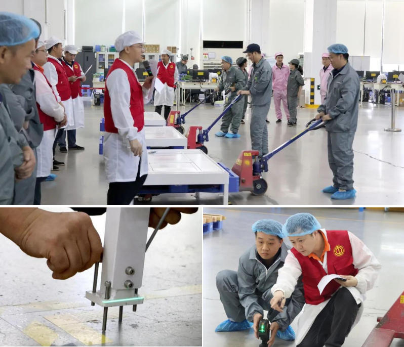 随着第一项比拼结束,更具挑战性的“设备水平调整”随即展开。这项被制造人亲切称为“打水平”的工序,要求选手们先用叉车精准定位设备,再使用激光水平仪进行微调。与平时只需调整四角受力点不同,本次比赛设置了16个受力检测点,难度大幅提升。“这就像在给设备‘做瑜伽’,每个支撑点都要达到完美平衡”一位选手如是说。激光水平仪的绿色光源在设备四周游走,选手们屏息凝神,力求精准。