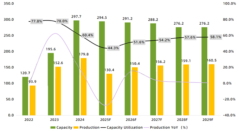 图:2022-2029年全球硅料产能产量变化趋势,Unit:万吨