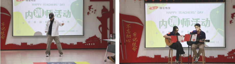 随后,深圳制造部同事以一段动感十足的街舞引爆全场掌声。自动化二部与S01项目部同事则用吉他弹唱《至少还有你》,以温暖旋律诉说着对导师们的深深感激。精彩纷呈的节目,充分展现了校招新锐的才华与活力,更传递出对全体导师最真挚的祝福。