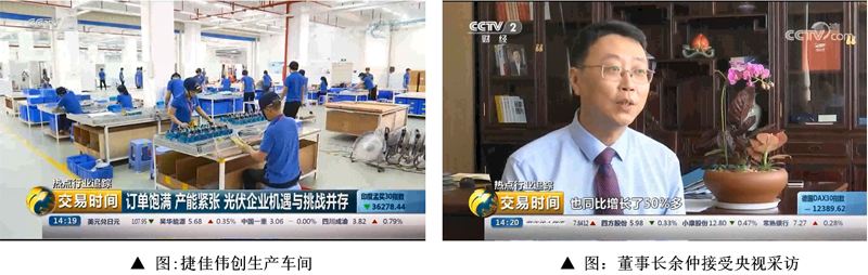 9月19日,央视财经频道《交易时间》栏目报道捷佳伟创。栏目通过“光伏企业中报业绩亮眼 行业供需拐点或将至”、“光伏发电成本持续降低 平价上网时代即将来临”、“订单饱满 产能紧张 光伏企业机遇与挑战并存”、“建筑屋顶发电受追捧 光伏行业发展前景广阔”四个主题的报道,以我司为范本,层层递进解析中国光伏产业发展现状,展望光伏产业未来发展前景,对中国光伏产业的发展表达了充分信心。