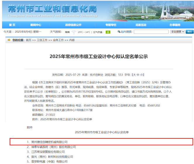 On July 29th, 2025, the Changzhou Bureau of Industry and Information Technology announced the list of 2025 Changzhou Municipal Industrial Design Center to be recognized. As a leading manufacturer of photovoltaic equipment, Changzhou S.C Exact Equipment Co., Ltd was successfully selected due to its outstanding R&D design capabilities and industrial application outcomes. This selection represents that the Company has received authoritative recognition for its innovative design in photovoltaic equipment.